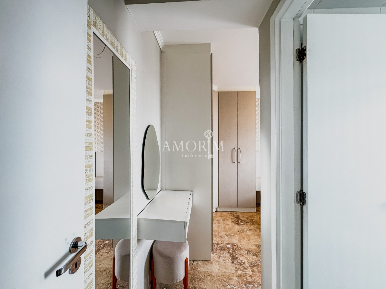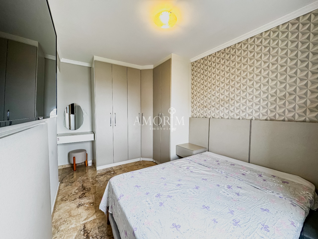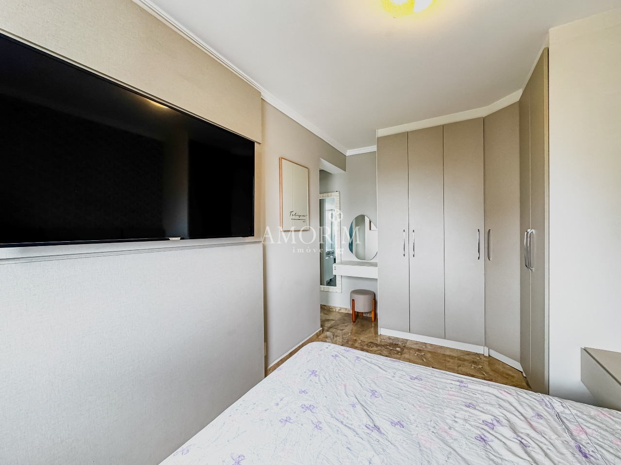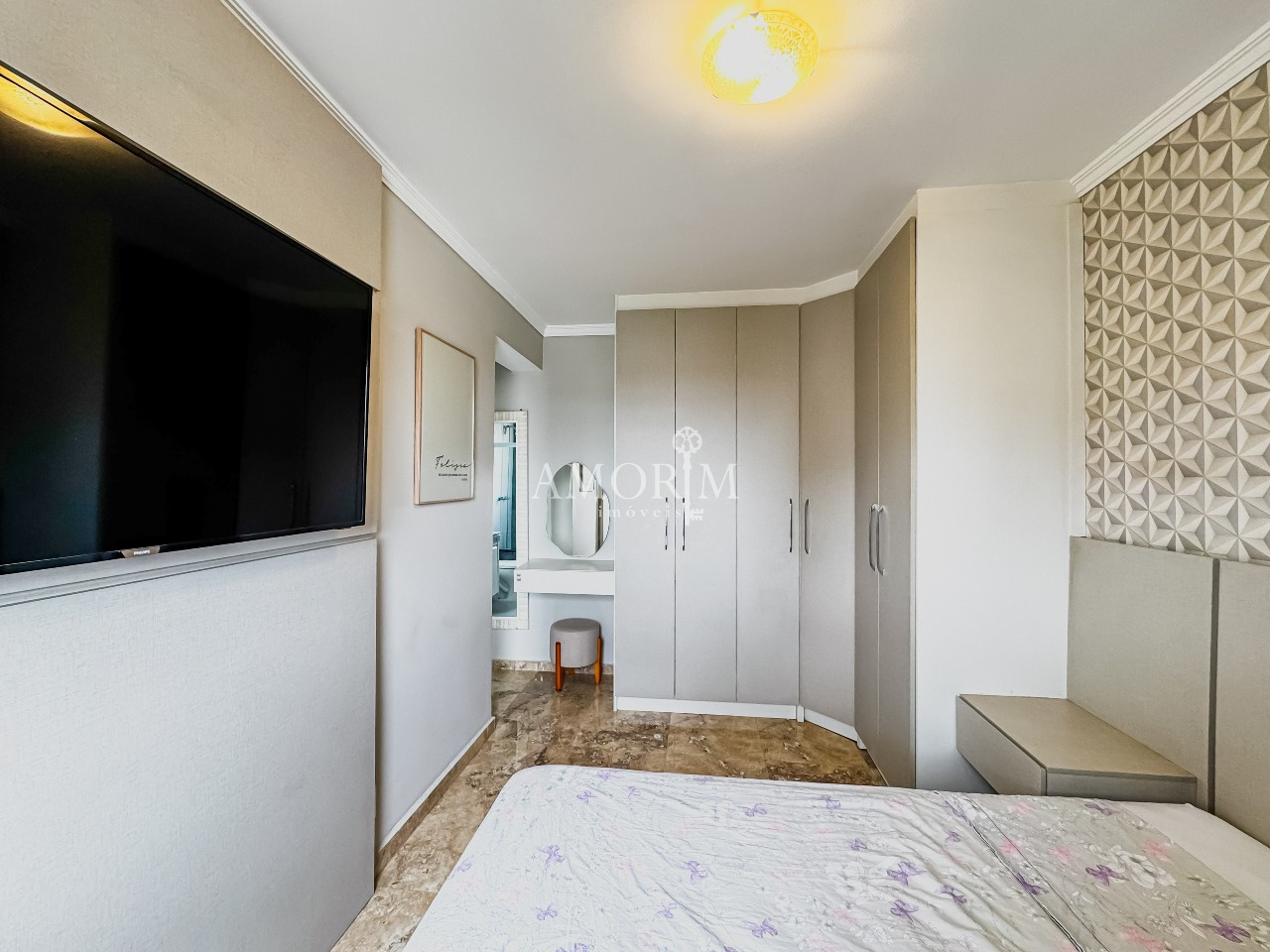 - Quarto de casal completo com armários, cabeceira, criados-mudos e painel de TV planejados