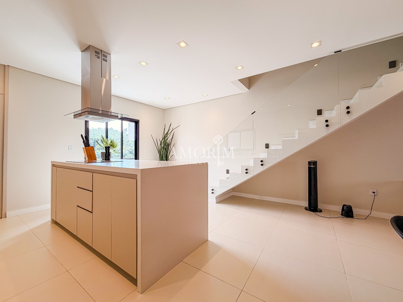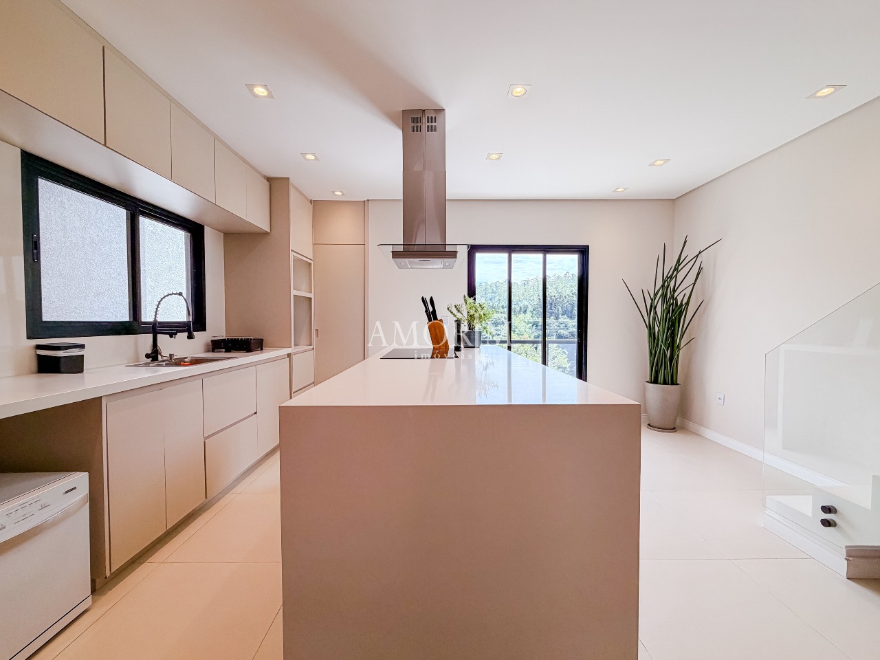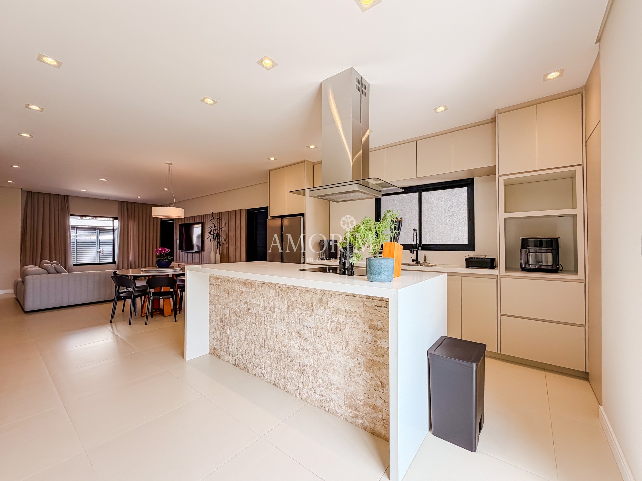 - Cozinha com bancadas em quartzo branco, travertino rockface e despensa oculta