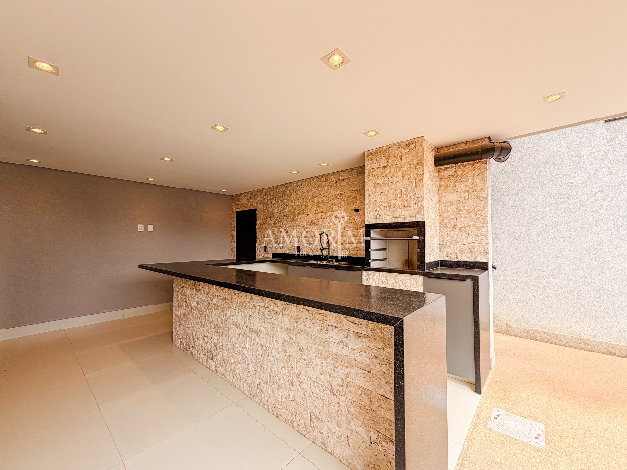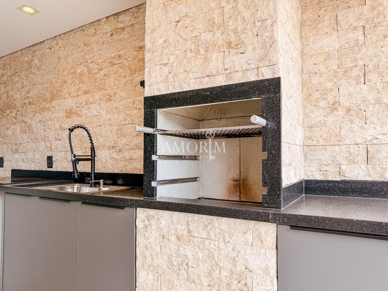 - Área gourmet com churrasqueira revestida de travertino e cooktop