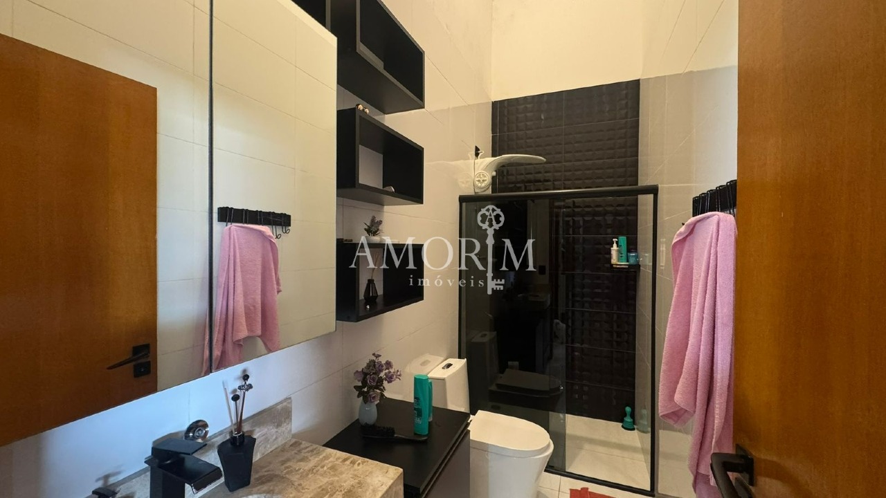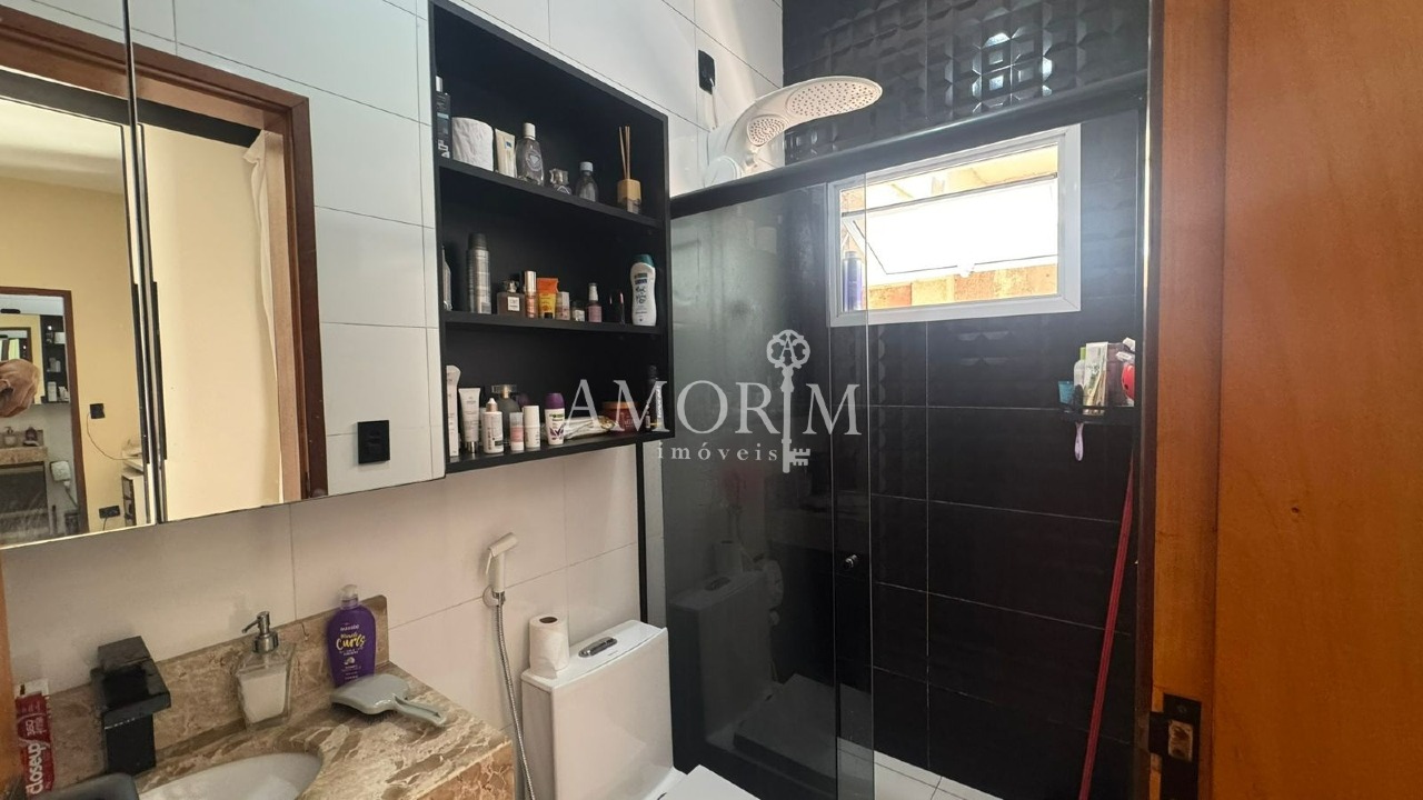 - Banheiro social com pé-direito alto, planejados, box preto e chuveiro