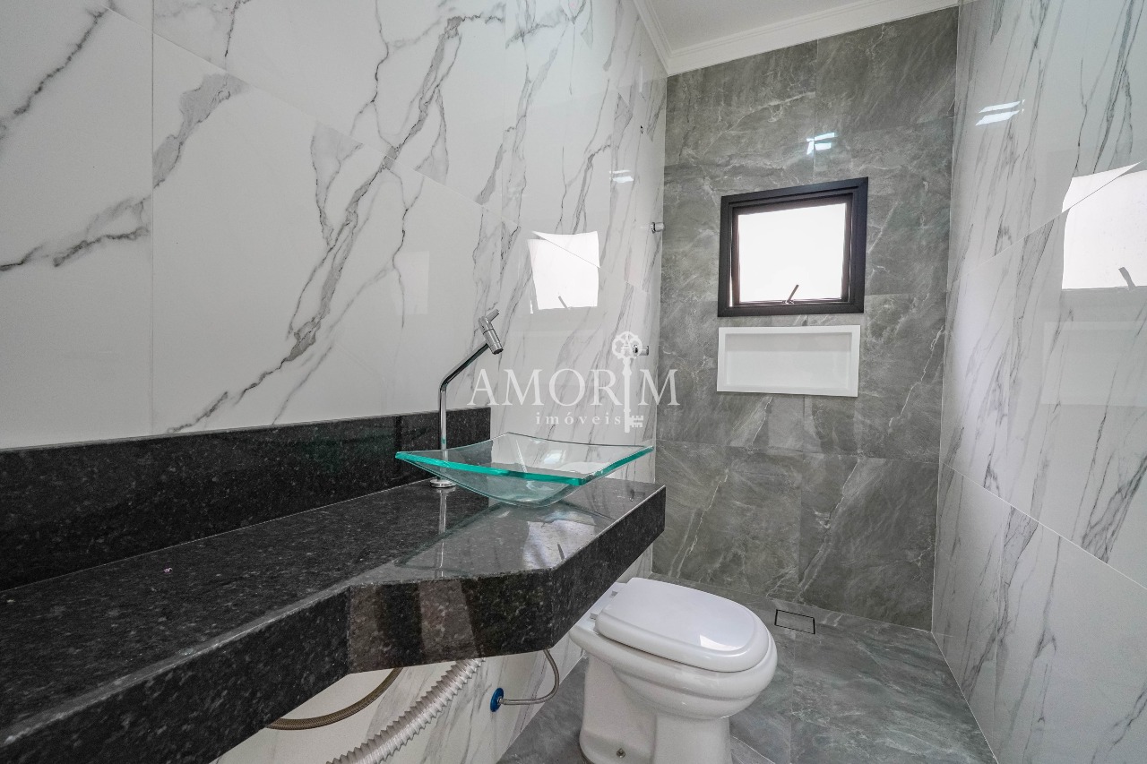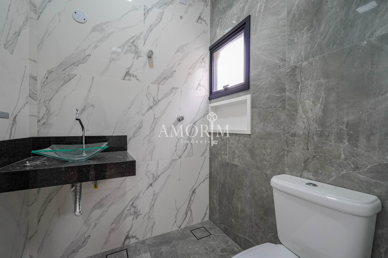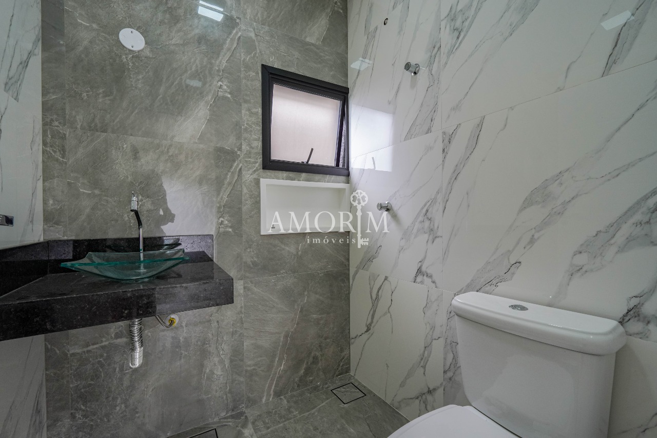 - Banheiro social com acabamento em porcelanato e pedra preto São Gabriel