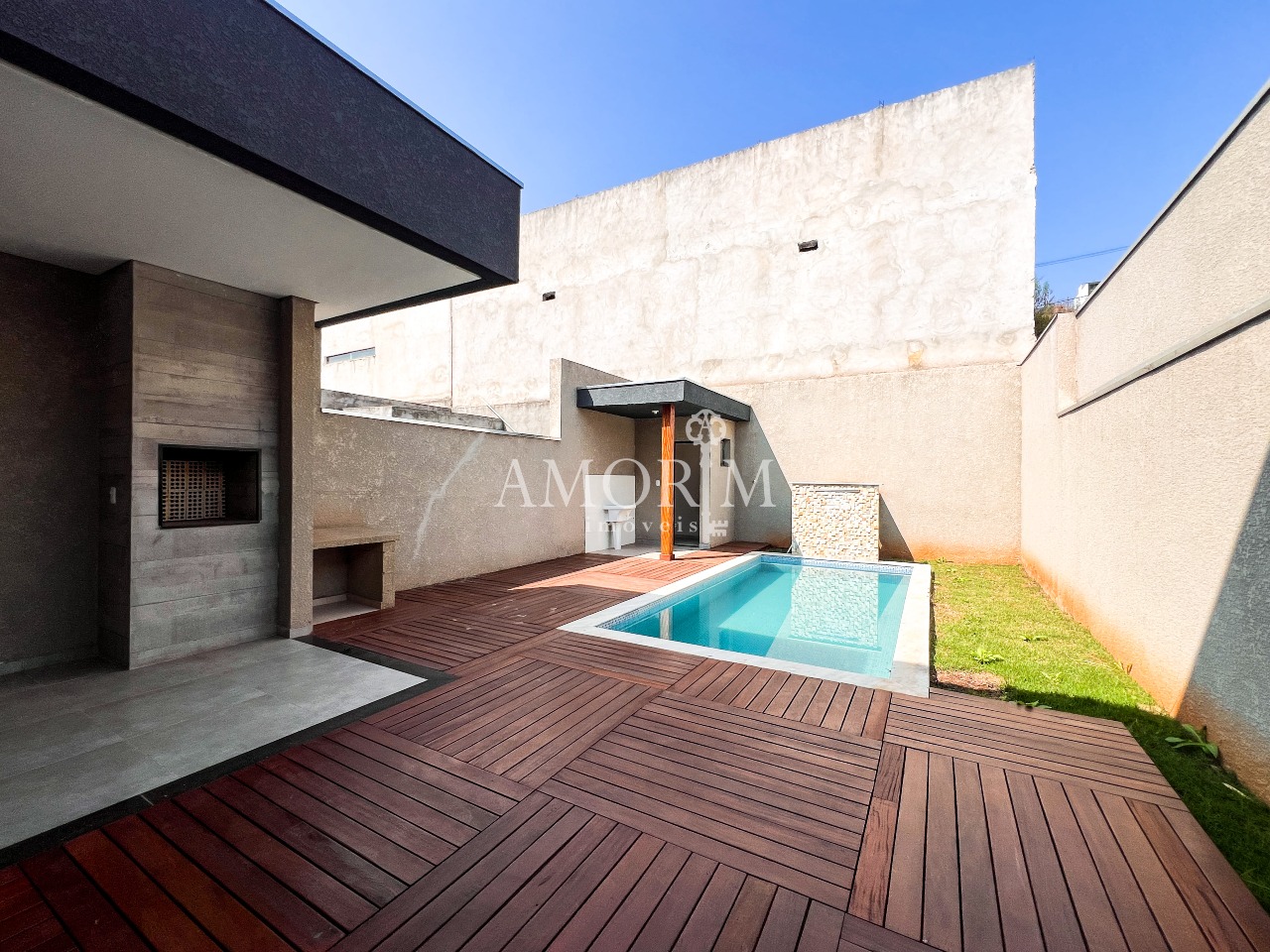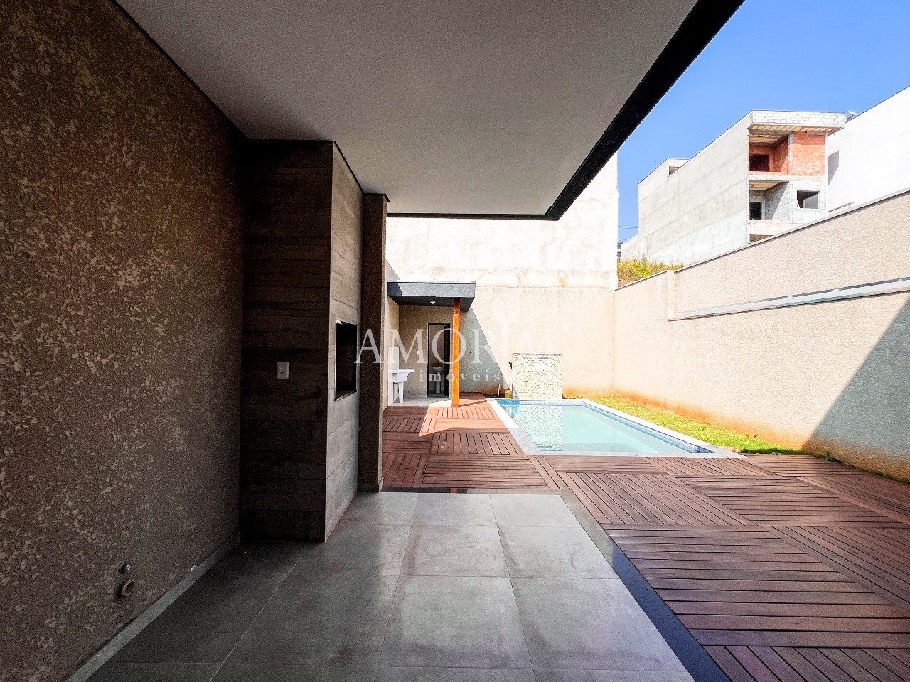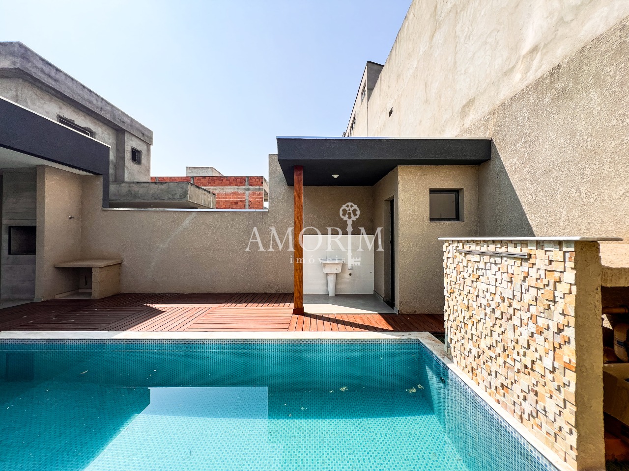 - Piscina com fonte e deck amadeirado