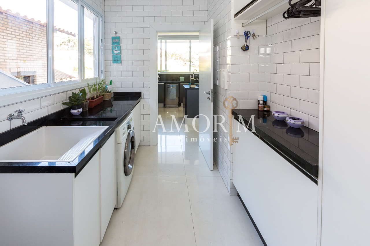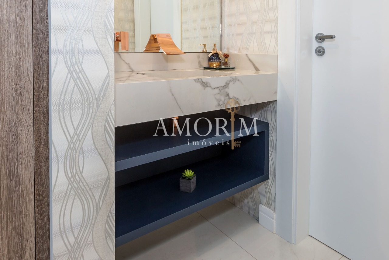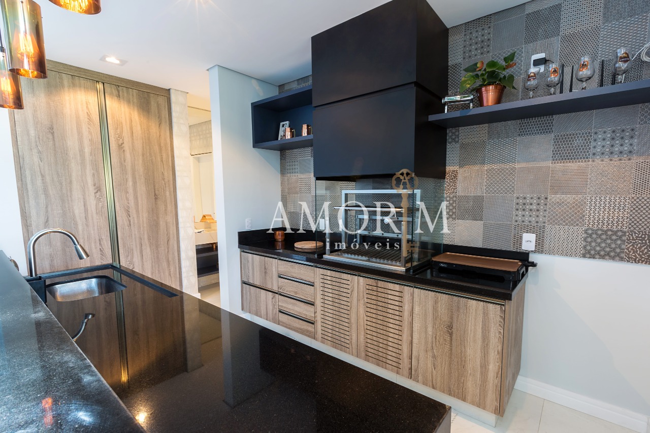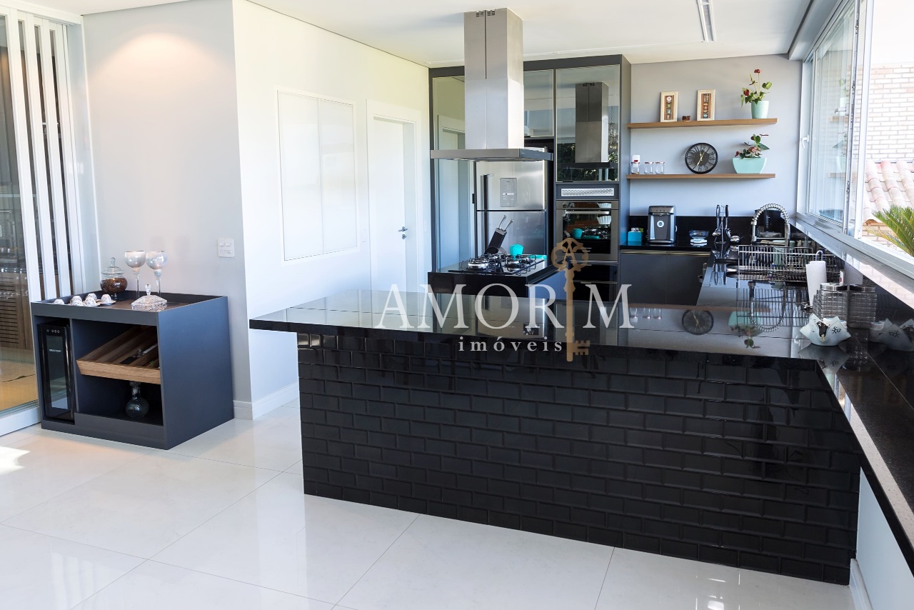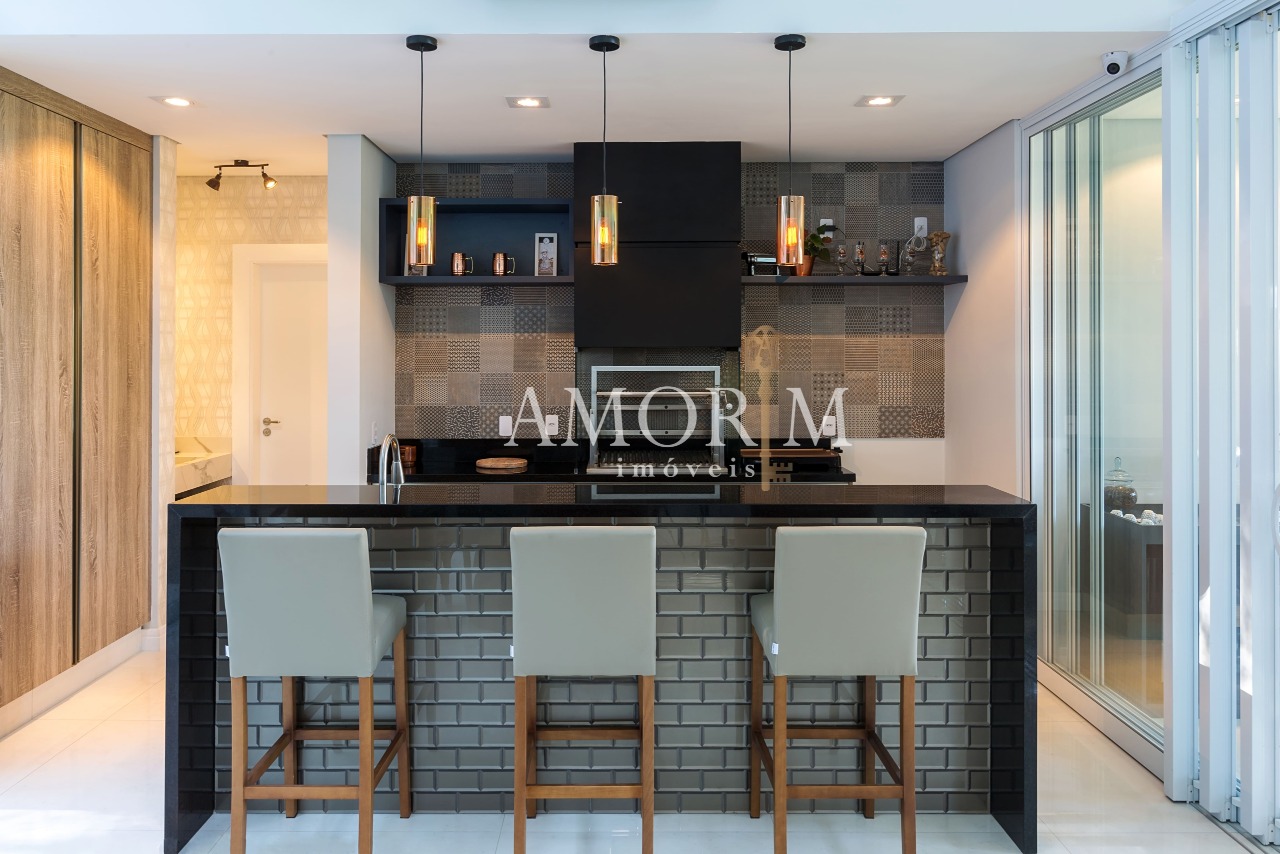 - Área gourmet com churrasqueira de inox, armários planejados e lavabo