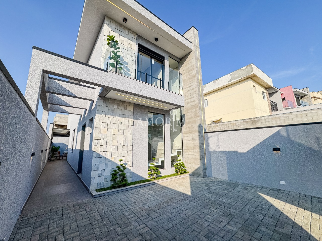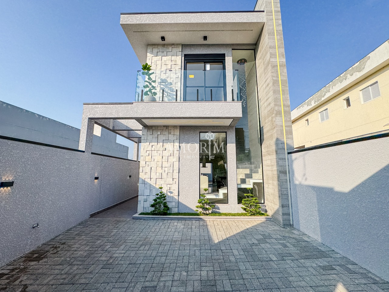 - Revestimento da fachada em Pedra São Tomé e textura projetada