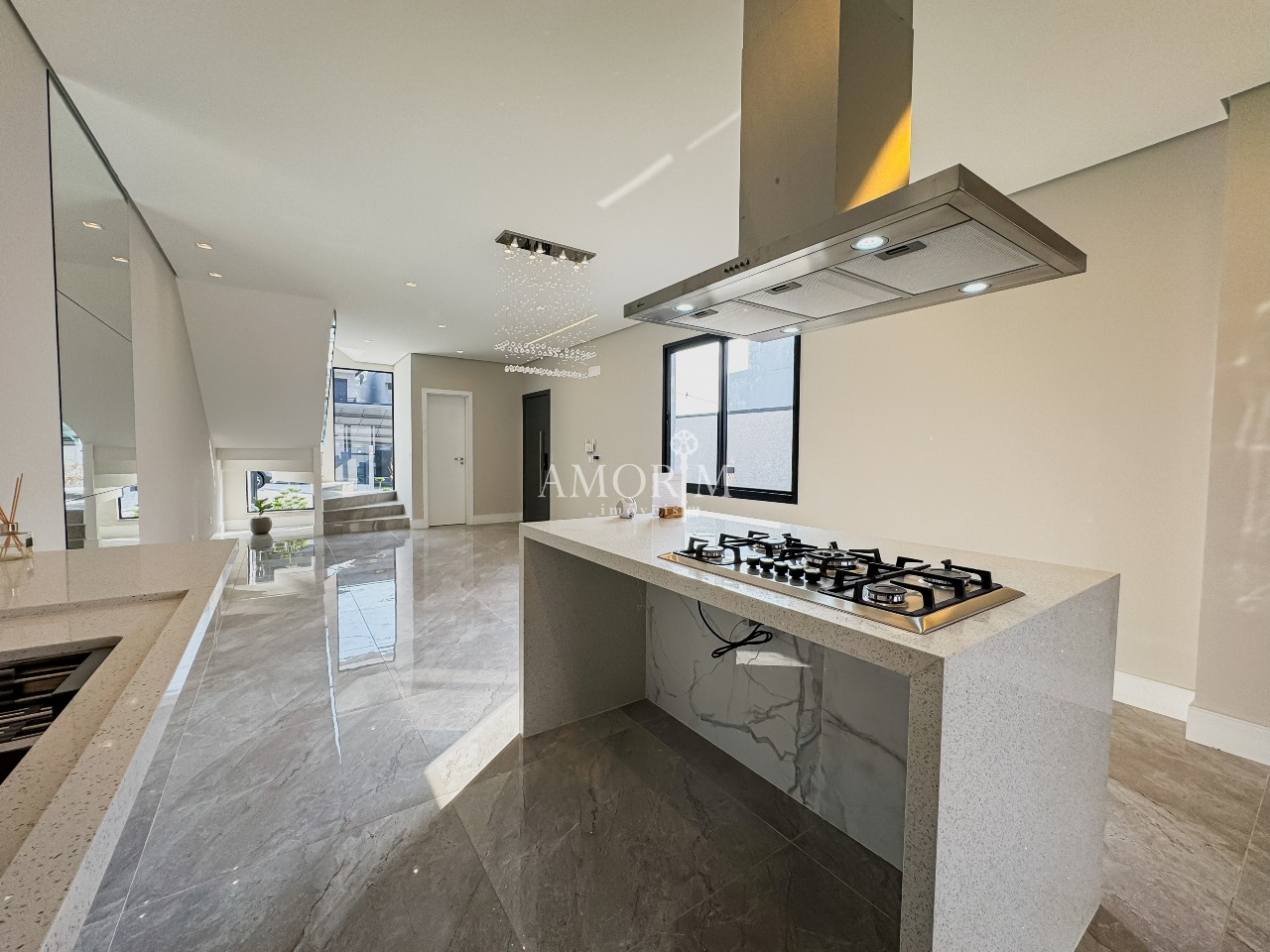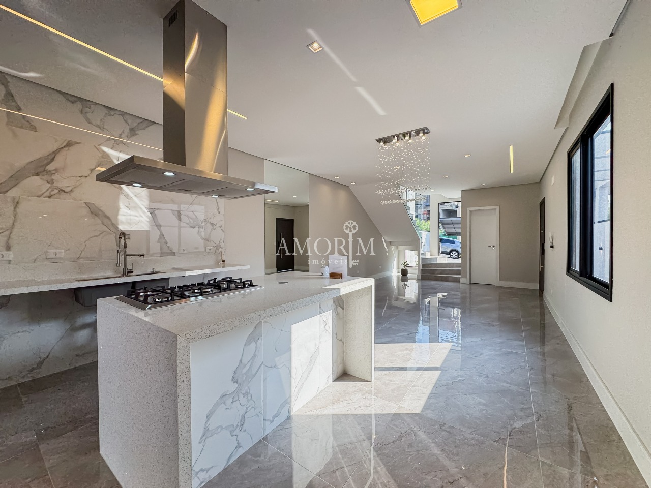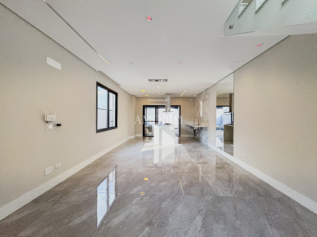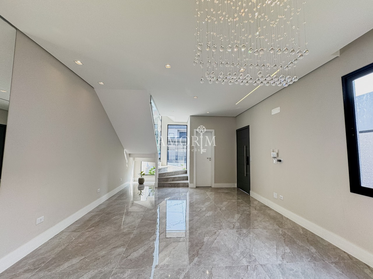 - Lustre de cristal na sala de jantar e escada