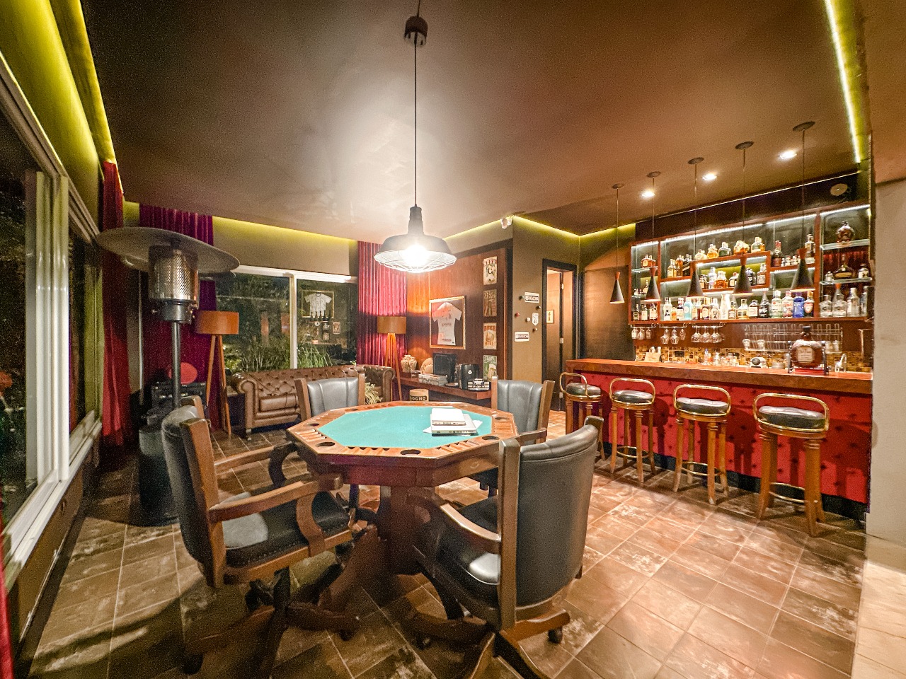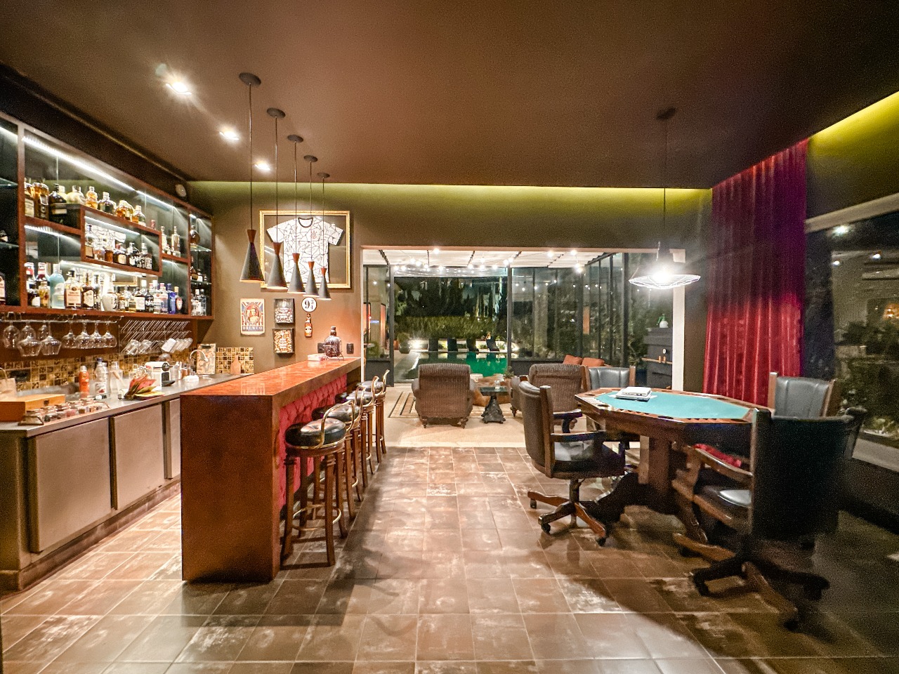 - Pub de decoração londrina com mesa de jogos, balcão refrigerado da Berta Cozinhas e lavabo com chuveiro
