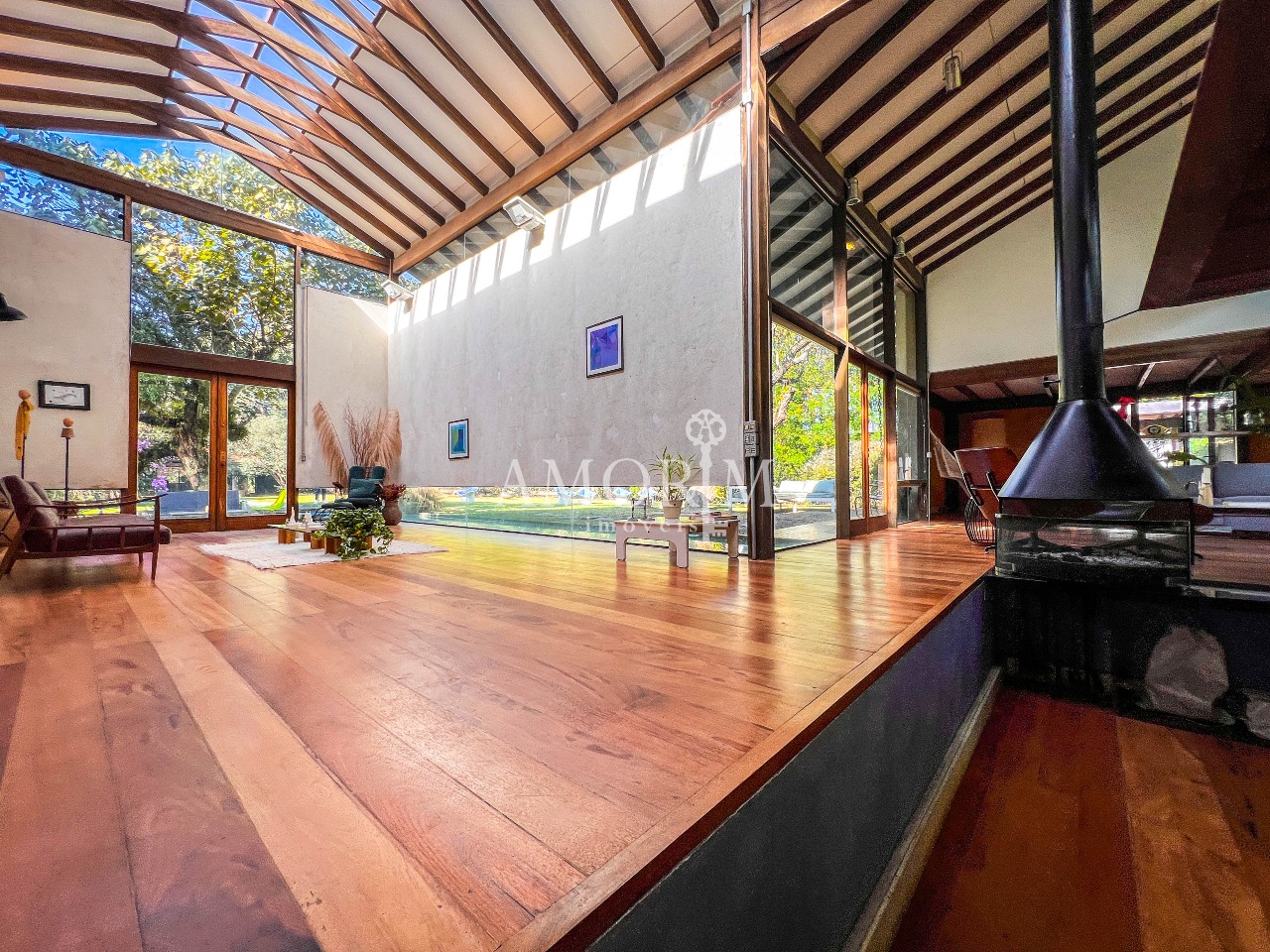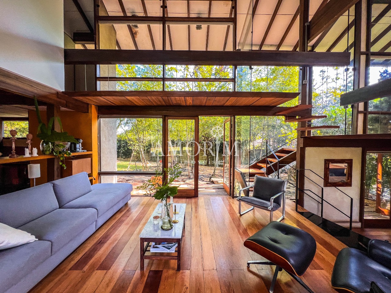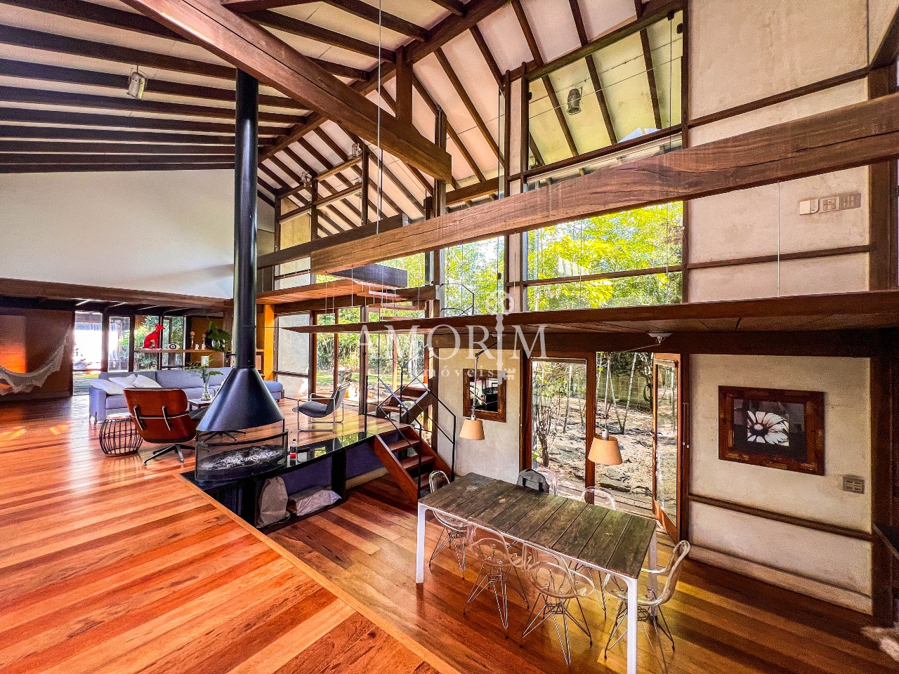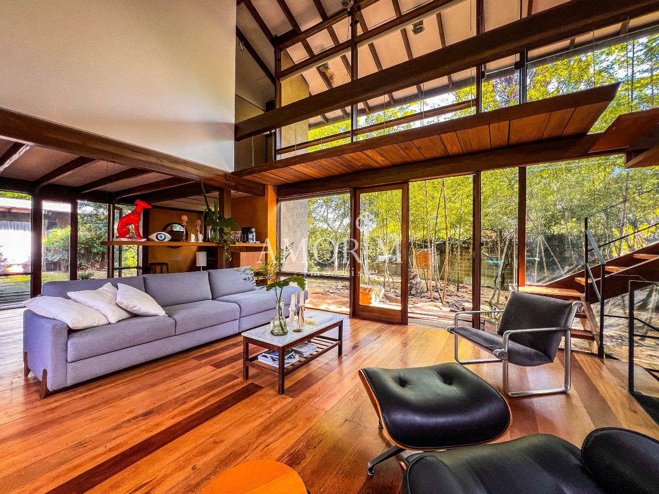 – Salas integradas em diferentes níveis, com lareira e pé direito elevado