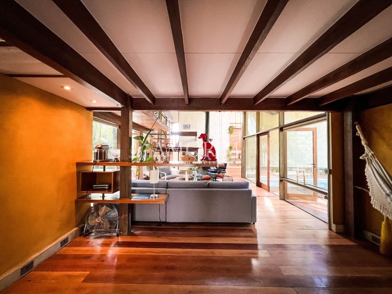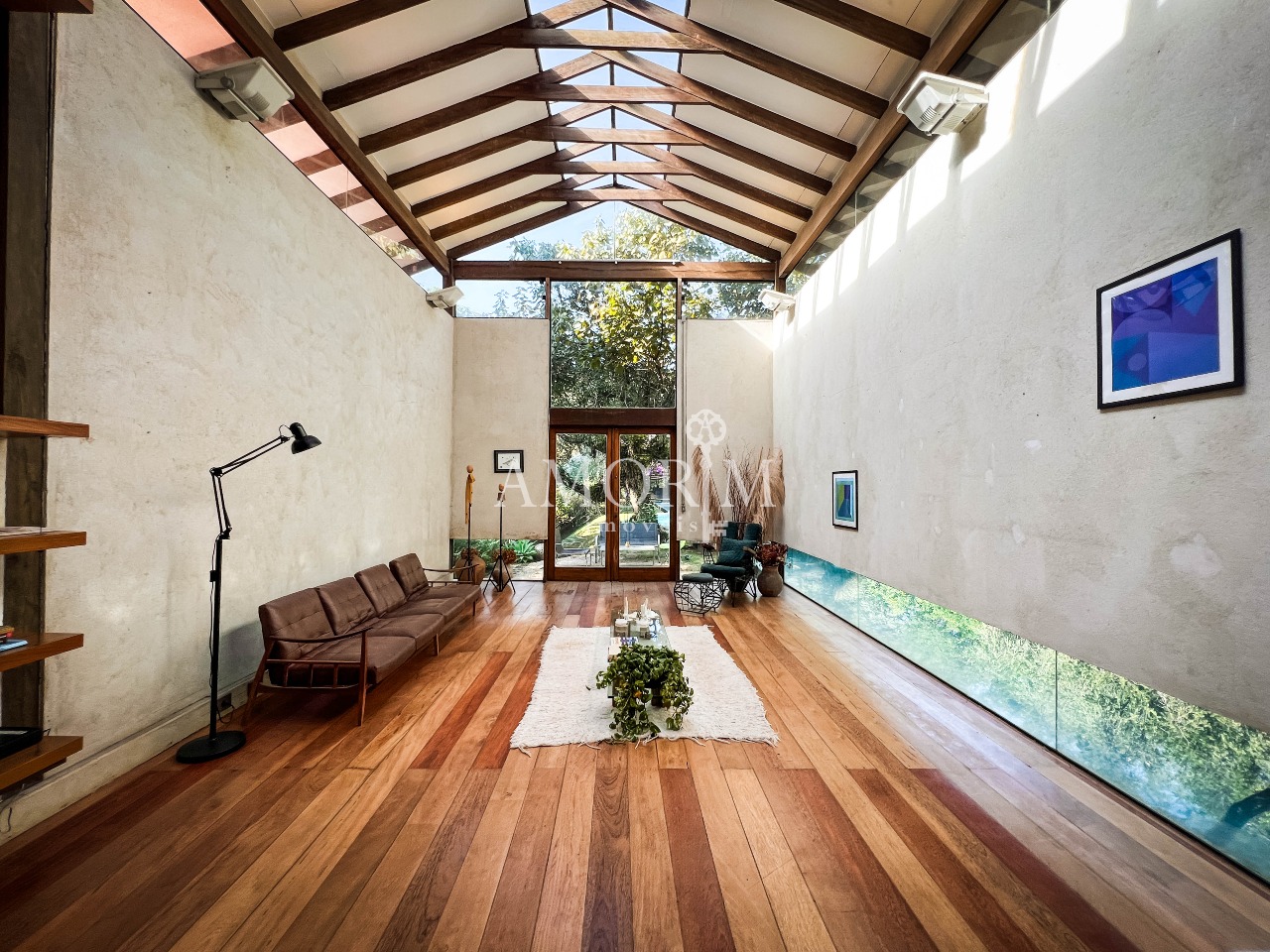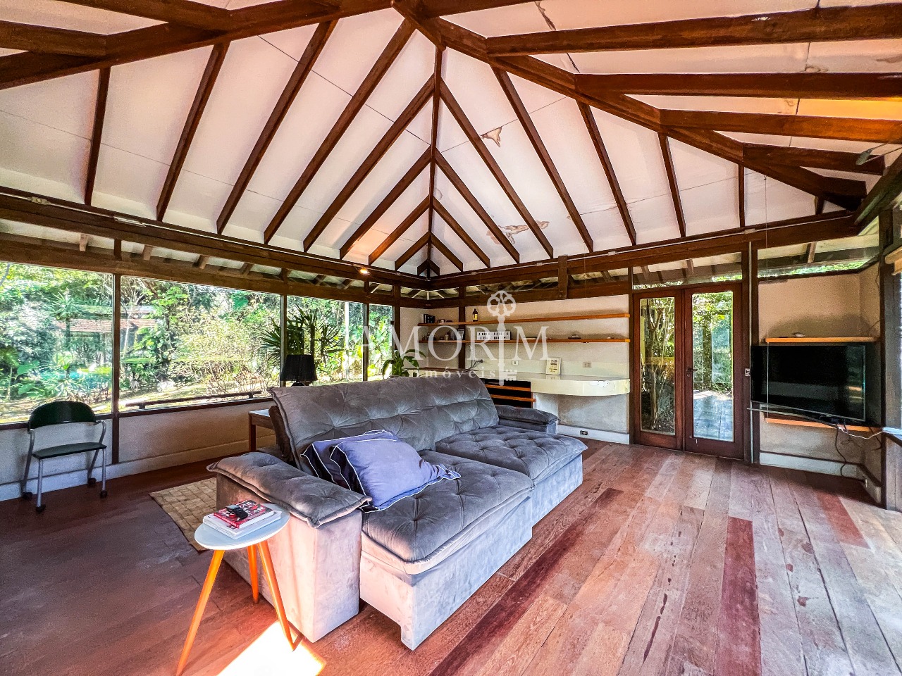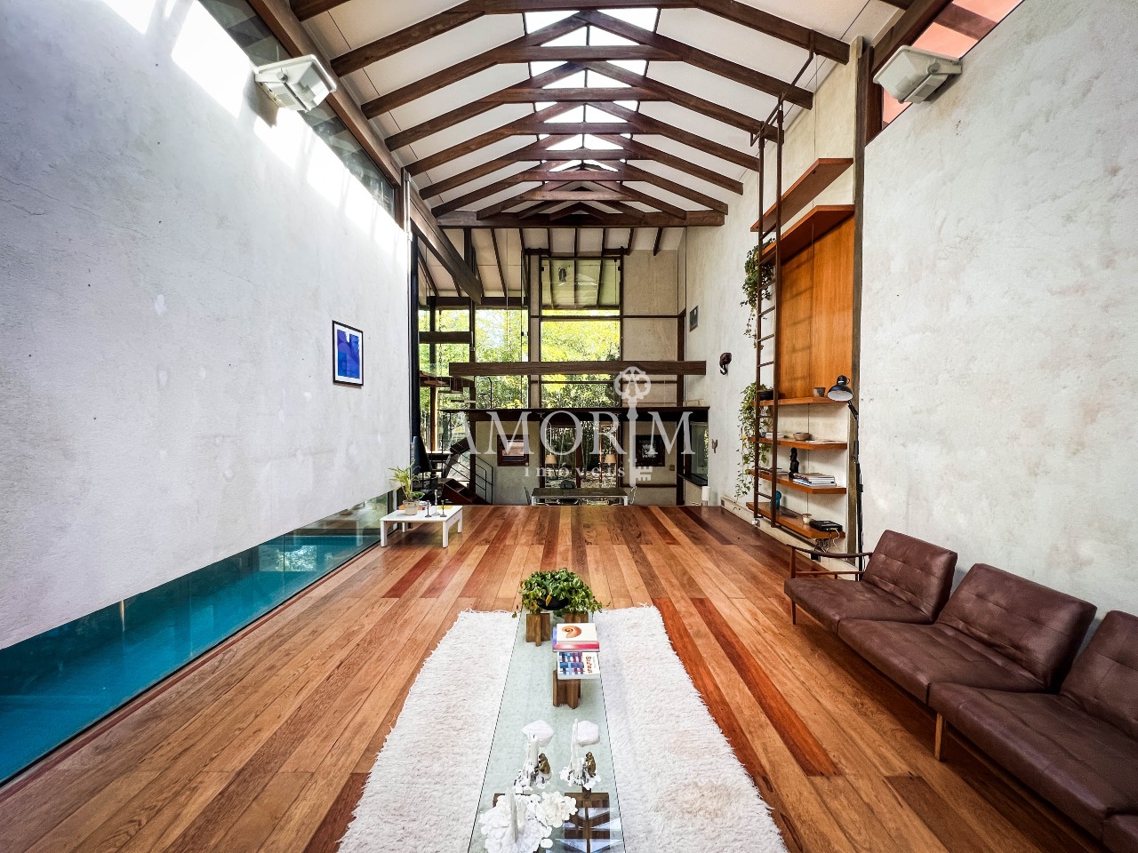 – Salas integradas em diferentes níveis, com lareira e pé direito elevado