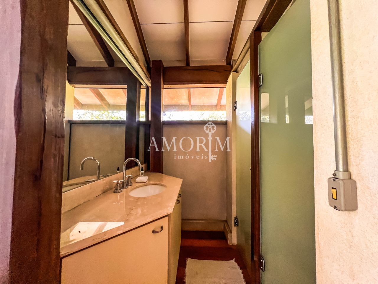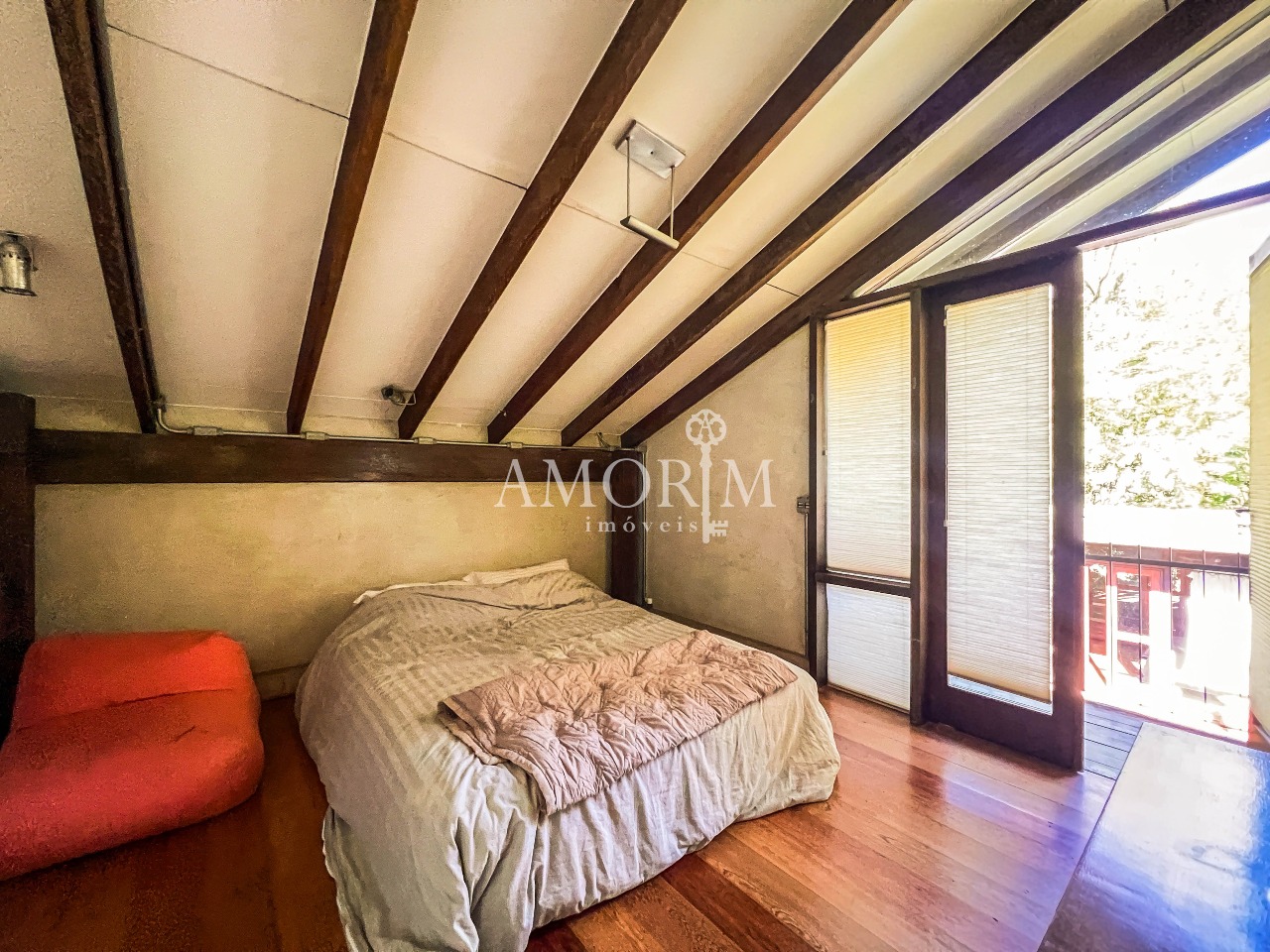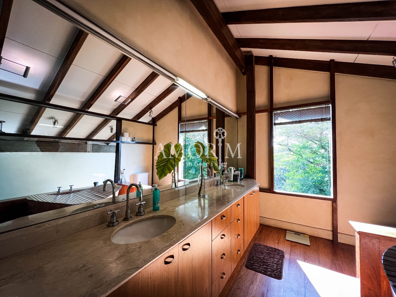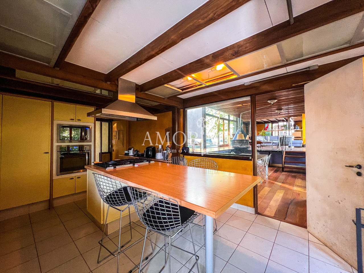 – Salas integradas em diferentes níveis, com lareira e pé direito elevado
