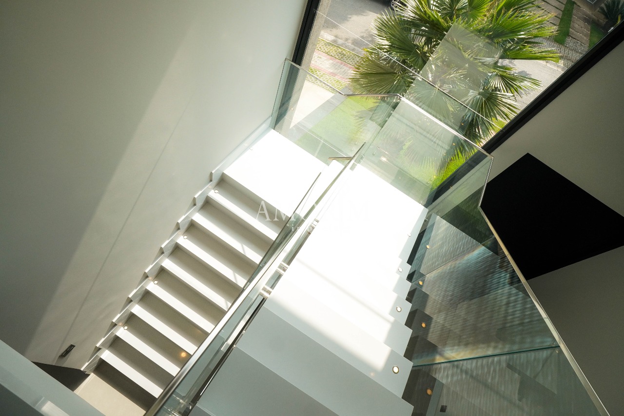 - Living com pé-direito duplo e grandes painéis de vidro para iluminação natural